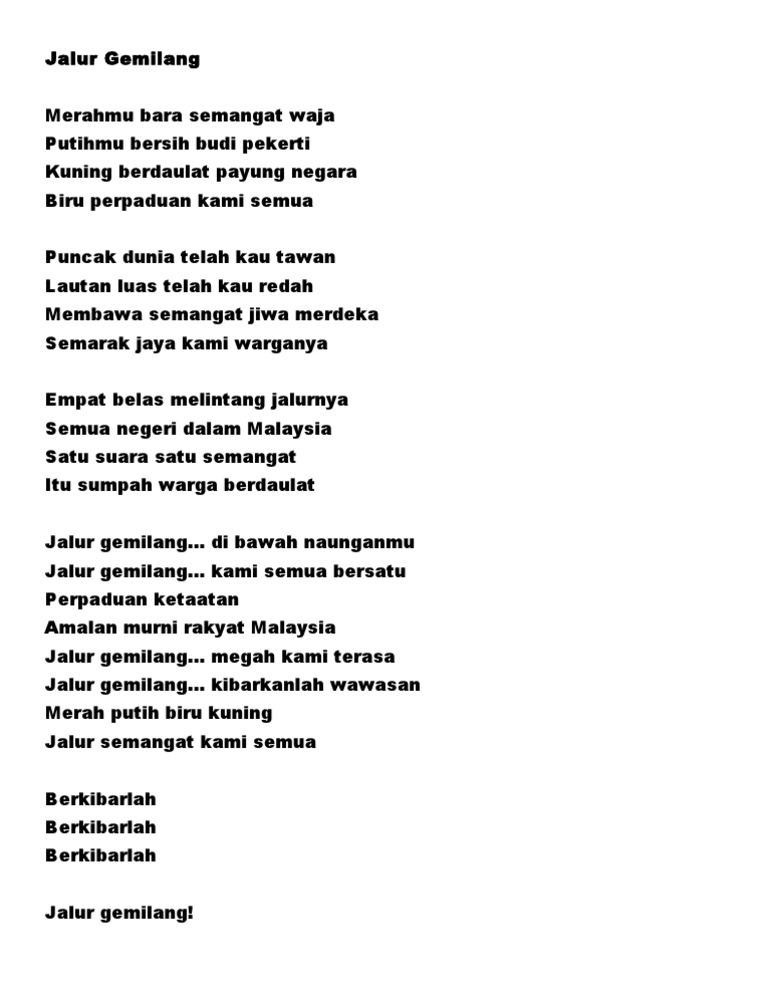 Lirik lagu jalur gemilang merahmu bara semangat waja putihmu bersih budi pekerti kuning berdaulat payung negara biru perpaduan kami semua puncak dunia telah kau tawan lautan luas telah kau redah membawa semangat jiwa merdeka semarak jaya kami warganya empat belas melintang jalurnya semua negeri dalam. Lirik Lagu Jalur Gemilang Merahmu bara semangat waja Putihmu bersih budi pekerti Kuning berdaulat payung negara Biru perpaduan kami semua Puncak dunia telah kau tawan Lautan luas telah kau redah Membawa semangat jiwa merdeka Semarak jaya kami warganya Empat belas melintang jalurnya Semua negeri dalam Malaysia. Merahmu bara semangat waja 1.