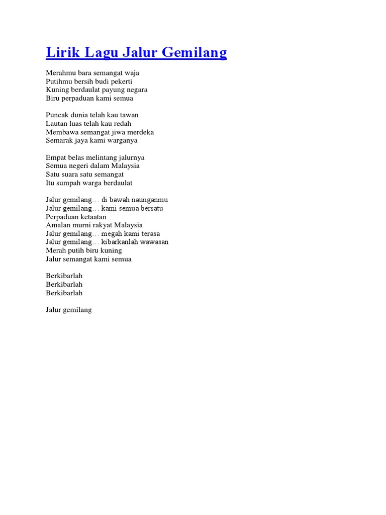 Biru perpaduan kami semua. Merahmu bara semangat waja Putihmu bersih budi pekerti Kuning berdaulat payung negara Biru perpaduan kami semua. Lirik Lagu Jalur Gemilang Merahmu bara semangat waja Putihmu bersih budi pekerti Kuning berdaulat payung negara Biru perpaduan kami semua Puncak dunia telah kau tawan.